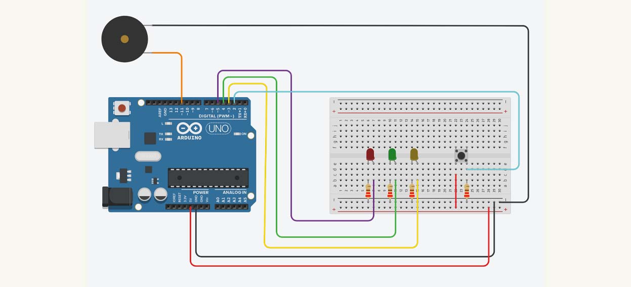 Realiza este proyecto utilizando Tinkercad y Arduino donde reproducirás cualquier música con una placa de Arduino, haciendo uso de la función tone() y noTone() podrás ejecutar las tonalidades de cualquier música en este ejemplo lo haremos de un villancico. El código o sketch de Arduino lo encontraras al final en esta misma página, así como el esquema que podrás descargarlos sin ningún inconveniente. Si deseas realizar el proyecto en físico deveras contar con tu tarjeta Arduino UNO, una placa de prueba (protobar), tres led de diferentes colores, 4 resistencias, un botón o pulsador (push button), un buzzer y los cablecitos para realizar las conexiones.